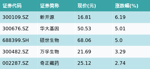 南财智讯5月12日电,天眼查显示,今日生物医药主题走弱,截至收盘(下同)下跌1.34%。持有生物医药主题股票的易方达中证生物科技主题ETF(159837)下跌0.67%,最新价报0.442元。截至上个交易日(5月9日),该基金近五个交易日净值(复权单位净值,下同)上涨0.57%,近一个月净值上涨3.25%。该基金自(20210114)成立以来净值增长率为-55.56%,管理人为易方达基金管理有限公司,基金经理为张湛。截至收盘,生物医药主题涨跌幅最高的五只股票为:新开源(300109.SZ)、华大基因(300676.SZ)、硕世生物(688399.SH)、万孚生物(300482.SZ)与奇正藏药(002287.SZ)。详情见下表: